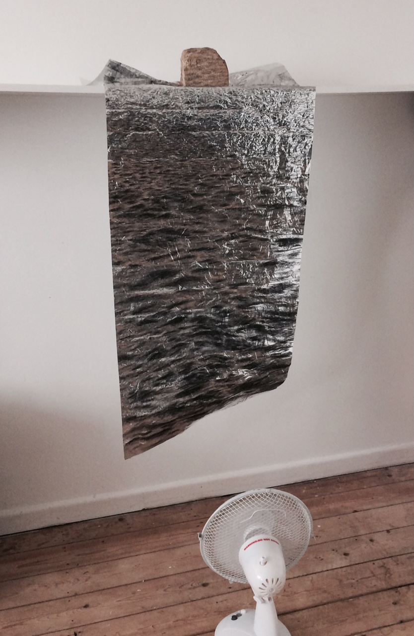 Previous Image Next Image Emma Coop, SUPPORTS, crayon on foil , brick with drawing and electric fan, 2017