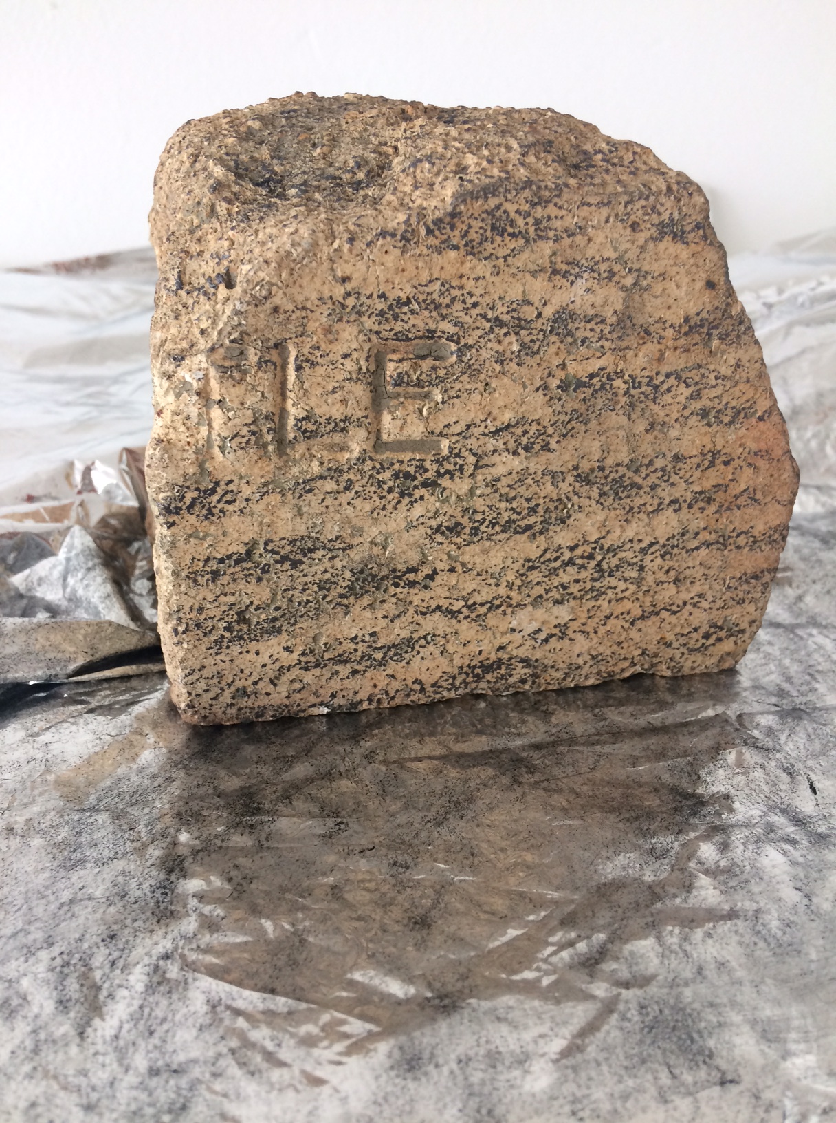 Previous Image Next Image Emma Coop, SUPPORTS, (detail) crayon on foil , brick with drawing and electric fan, 2017